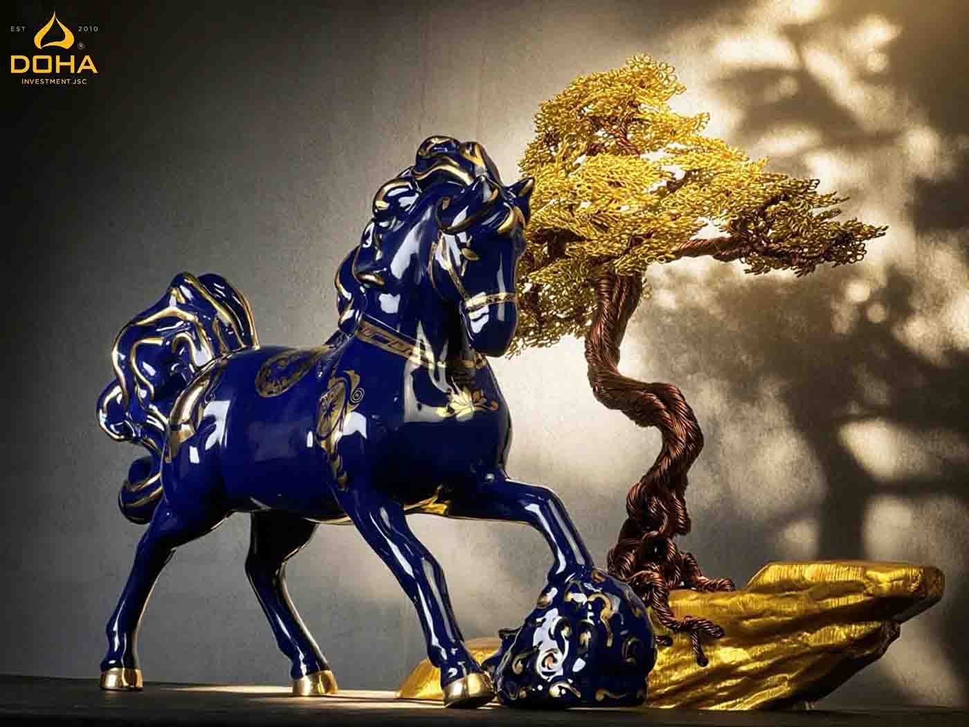- Bình rượu con ngựa Doha được làm từ Đôn men sứ cao cấp, điêu khắc nghệ hình ảnh bản độ Việt Nam, kết hợp họa tiết mạ vàng 23k, giữ guyên thẩm mỹ theo thời gian,với 2 bảng màu xanh dương – tinh tế, thanh thoát và đen – sang trọng, quyền lực. Hoạ tiết vàng vẽ tay tinh xảo, thể hiện sự công phu và giá trị nghệ thuật.